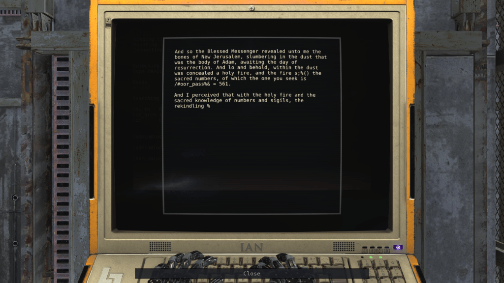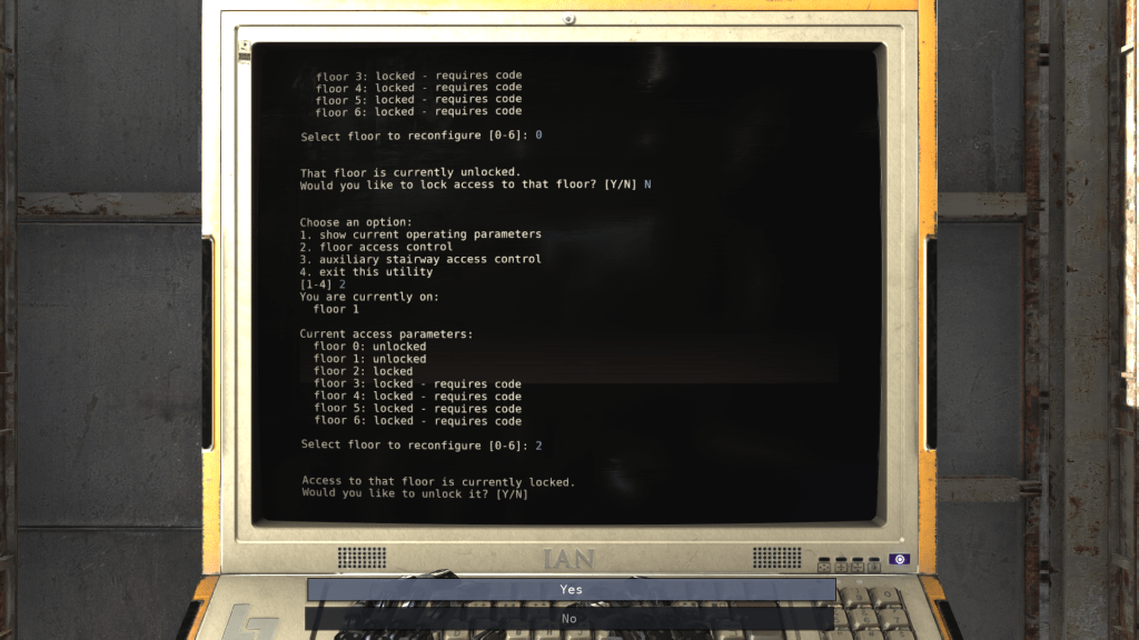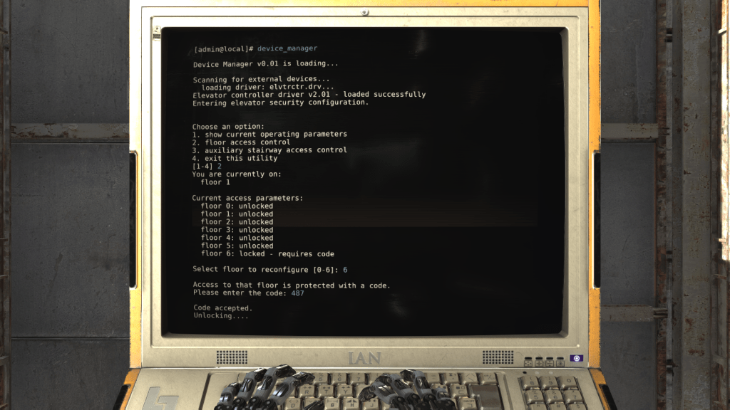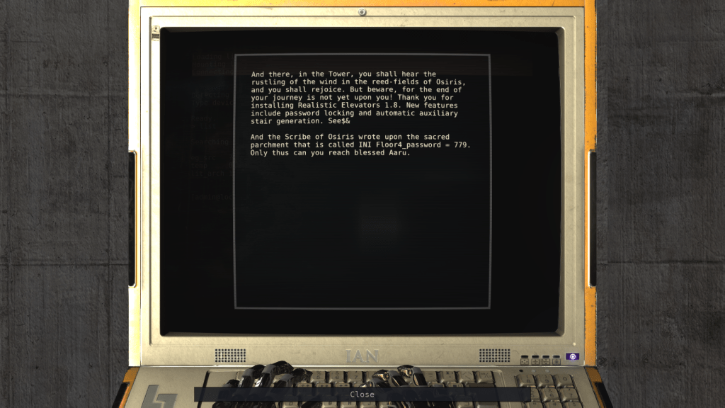 At the end of every Tower level, the player has to interact with a terminal unlocking the next floor.
